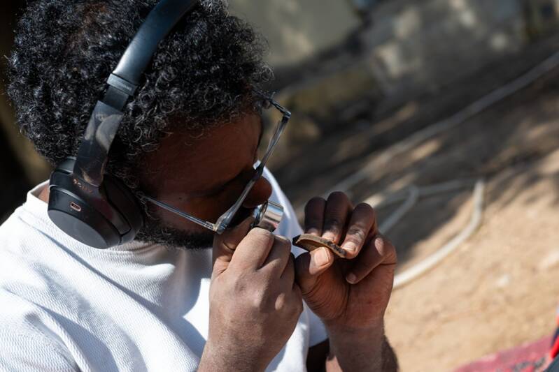 Above: PhD researchers Daniele Zampierin and Alex Mohns setting out on an early-morning survey. Below: PhD researchers Sam Botan, Alex Mohns and Daniele Zampierin at work throughout the site, September 2025. (Photos by M. van Aerde).